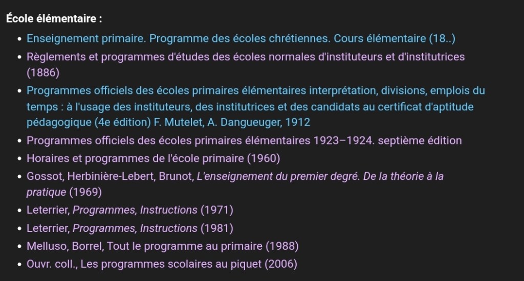 J’ai trouvé mon bonheur grâce au site « Manuels anciens » qui donne, entre autres choses, les liens vers les différents programmes ou livres commentant les programmes. Ceux-ci datent de 1912, 1923, 1960, 1969, 1971, 1981, 1988 et 2006.