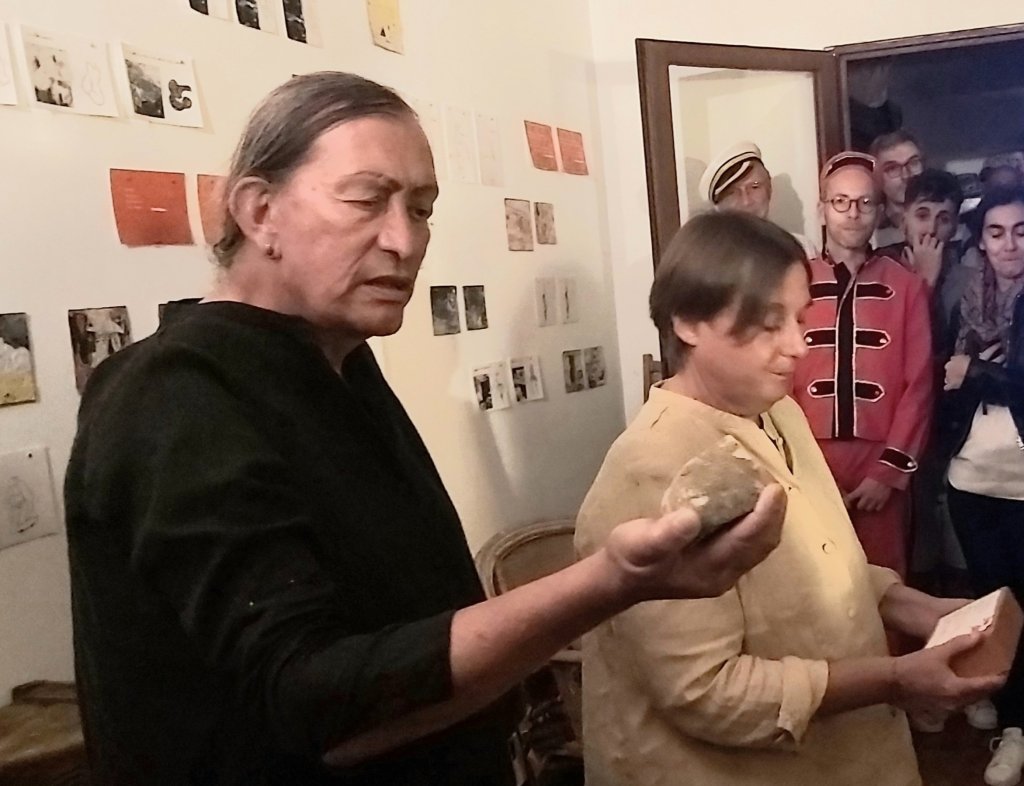 À l’issue de la représentation, les hôtes Nathalie Léger et Lou Spry ont proposé une performance artistique et poétique. Elles ont indiqué collaborer sur le plan artistique depuis 2015. Il ne s’agissait pas, cette fois-ci, d’humour, mais d’un questionnement sur le corps, en particulier le corps féminin, à partir de l’origine du monde de Courbet. Au mur, des reproductions d’oeuvres plastiques de Nathalie Léger. Au sol, un empilement de briques rouges, sur lesquelles étaient écrits des poèmes lus à haute voix. Un accompagnement sonore accompagnait le tout. Merci à elles pour cette performance.
