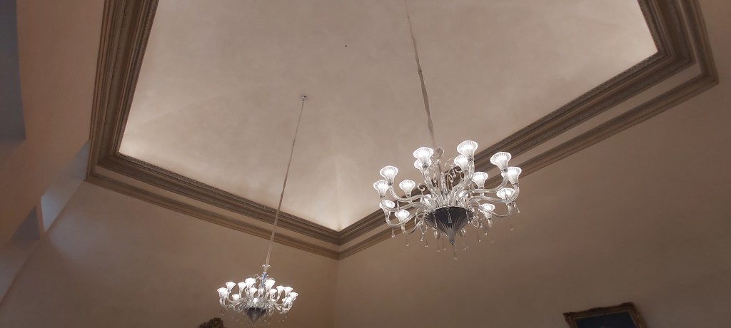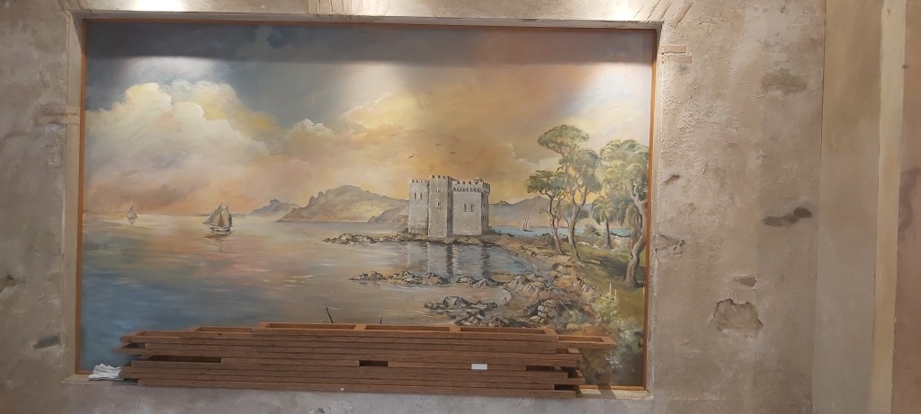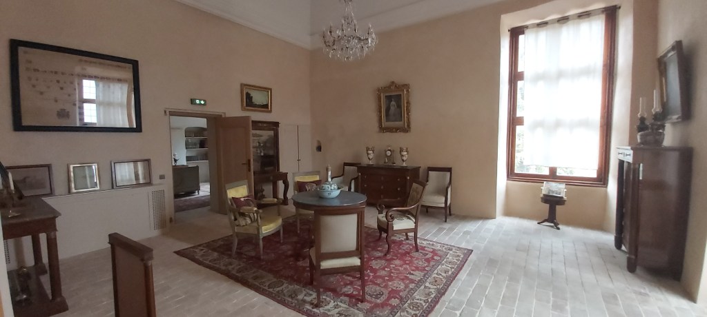 À l’étage, on trouve des salons, une salle à manger, une petite chambre, une chapelle, mais aussi, à l’entresol, une pièce voûtée qui servait d’étable ou de bergerie. On monte enfin à une grande salle de réception, où nous attend une surprise.