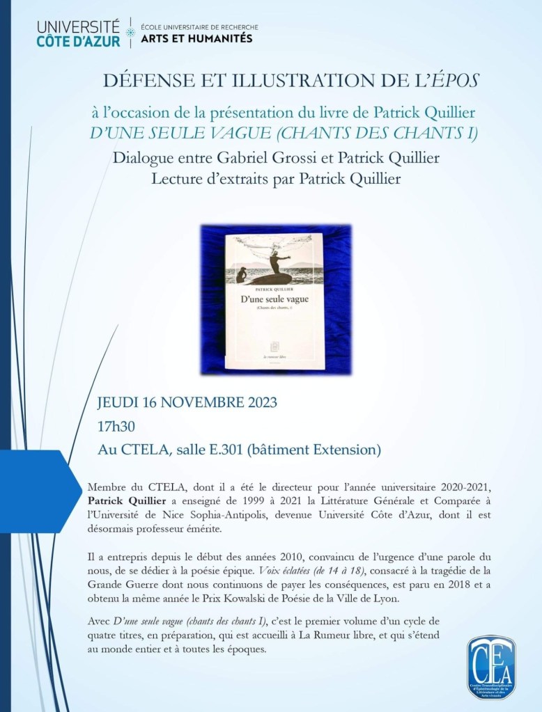 Patrick Quillier me fait l’honneur de m’avoir choisi pour présenter son livre, lors d’un dialogue entrecoupé de lectures qui se tiendra à la faculté des Lettres de Nice, boulevard E. Herriot, au troisième étage du bâtiment de l’extension. Dans les locaux du CTELA dont je suis membre, nous discuterons de l’épos, de la poésie épique, du besoin urgent d’une parole qui refonde le collectif, des avatars de l’aède contemporain, et de son oreille ouverte sur le monde.