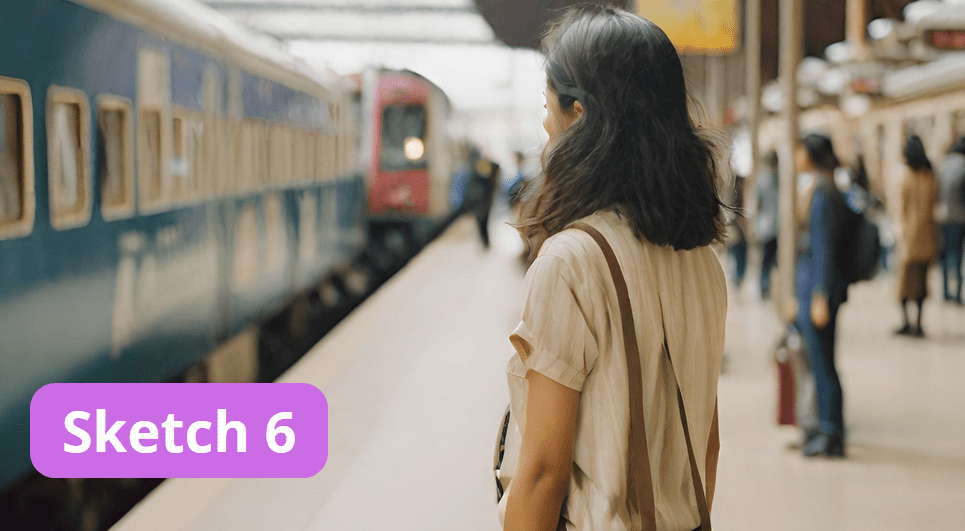 Sur une musique, jingle SNCF, bruits de train, déplacements avec bagages. Personnages qui courent, d’autres qui croulent sous les sacs, une valise qui se renverse, personnages qui se bousculent, qui prennent des photos, qui se disent au revoir. Durée de 1 min.