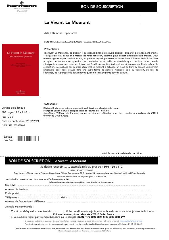 Il y a quelque mois, j’ai été invité par Béatrice Bonhomme à participer à un ouvrage collectif, qu’elle codirige avec Jean-Pierre Triffaux et Françoise Salvan-Renucci, sur le thème « Le Vivant — le Mourant ». Ces deux notions, à la fois opposées et complémentaires, sont sans doute très intéressantes pour penser bien des aspects de la littérature et des arts vivants.