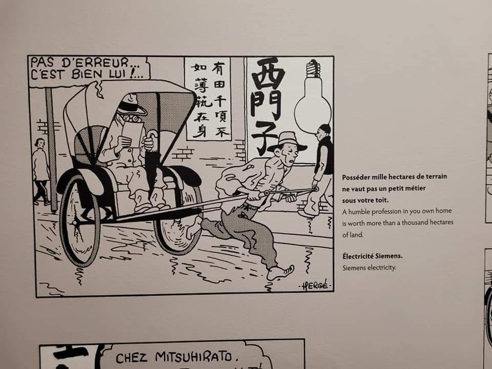 On apprend notamment lors de cette exposition que tous les idéogrammes chinois présents dans la bande dessinée sont vrais, là où Hergé aurait pu se contenter d’une imitation fantaisiste. Plusieurs planches sont exposées avec la traduction française en regard. L’auteur-dessinateur belge s’est abondamment documenté, notamment grâce à Tchang, pour représenter les pays asiatiques que l’on peut voir dans Le Lotus bleu et dans Tintin au Tibet. À une époque où la plupart des Européens n’avaient qu’une vision tris stéréotypée des pays asiatiques, Hergé nous montre des monuments, des paysages, des coutumes avec une précision fascinante.