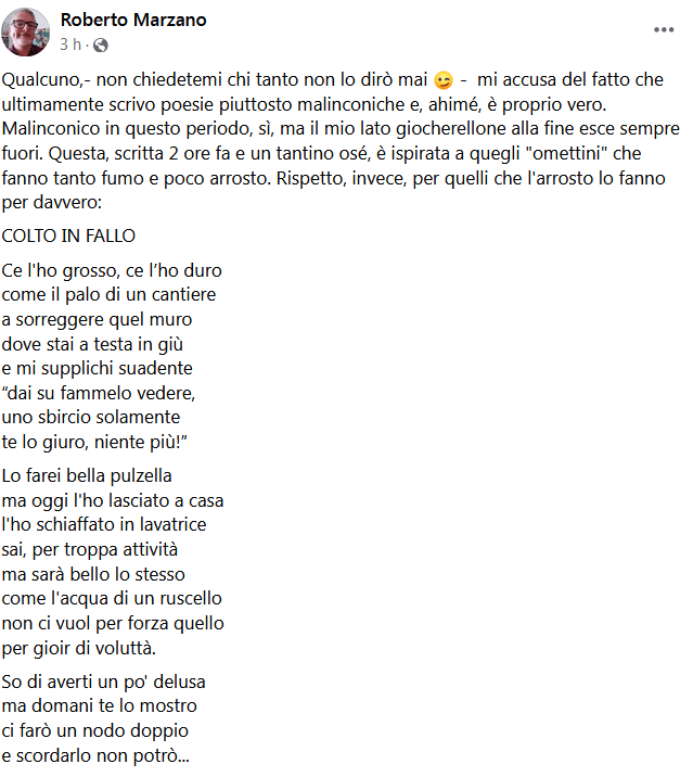 Roberto Marzano a récemment publié sur Facebook un poème malicieux, qui ne se prend pas au sérieux, et se moque gentiment de ces vantards qui font beaucoup d’esbroufe, comme on dit par chez moi, mais qui n’en ont pas tant que ça dans le pantalon. Avec l’autorisation du poète, je vous propose de découvrir ce poème, en version originale et dans une traduction personnelle.