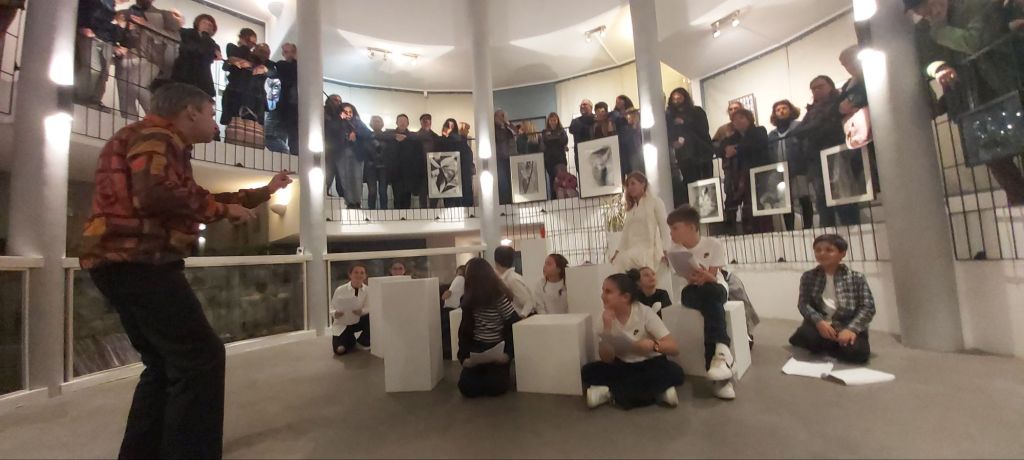 Isabelle Servol, performeuse et danseuse, a joué ce soir le rôle de Dame Poësie, autour de laquelle gravitant le choeur des poètes de l’école Marcel Pagnol de la Gaude. En robe de mariée, elle guidait par ses ponctuations corporelles les élèves de CM1 qui avaient écrit leurs propres textes et les ont performés comme de véritables artistes.