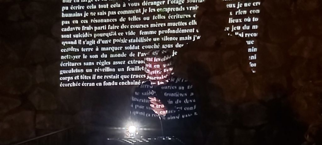 Pascal Giovannetti, poète, animateur de la scène slam de la Cave Romagnan, attendait les gens dans les jardins, dans l’obscurité de la nuit. Un vidéoprojecteur affichait des textes sur son corps pendant qu’il déclamait ses propres poèmes, dans une performance insolite où le poète semble comme saturé par les mots.