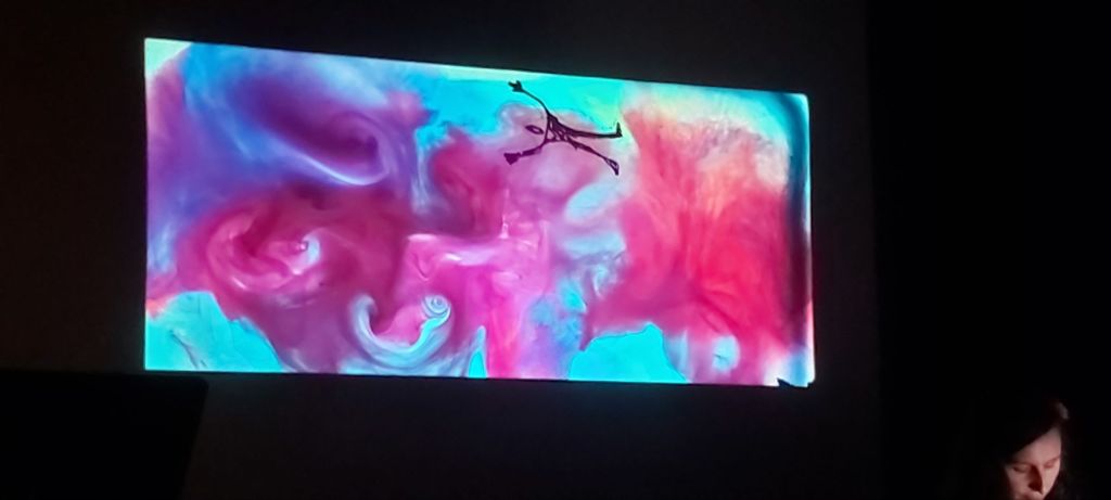 Laurie Camous a proposé une performance d’objets, utilisant le rétroprojecteur comme théâtre d’ombres, déplaçant des feuilles découpées, dessinant un des transparents, dans une scénographie projetée. Elle a ensuite placé une bassine d’eau sur le plateau du rétroprojecteur, dans lequel elle faisait tomber des gouttes d’encre qui se diffusaient en volutes. Des figurines d’animaux plongées dans l’encre rouge ont évoqué une étrange hécatombe.