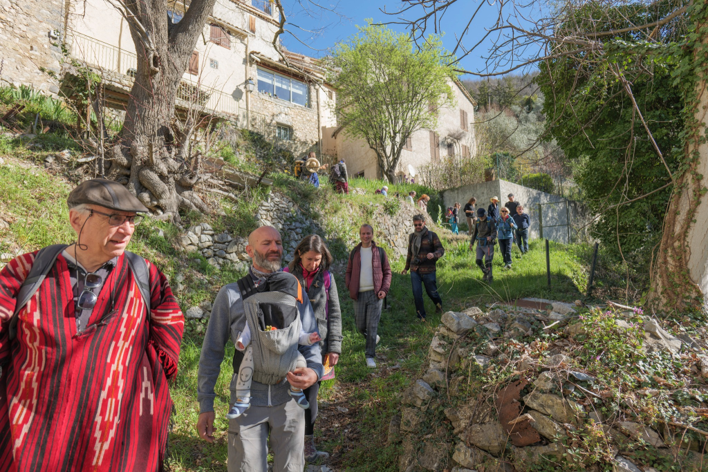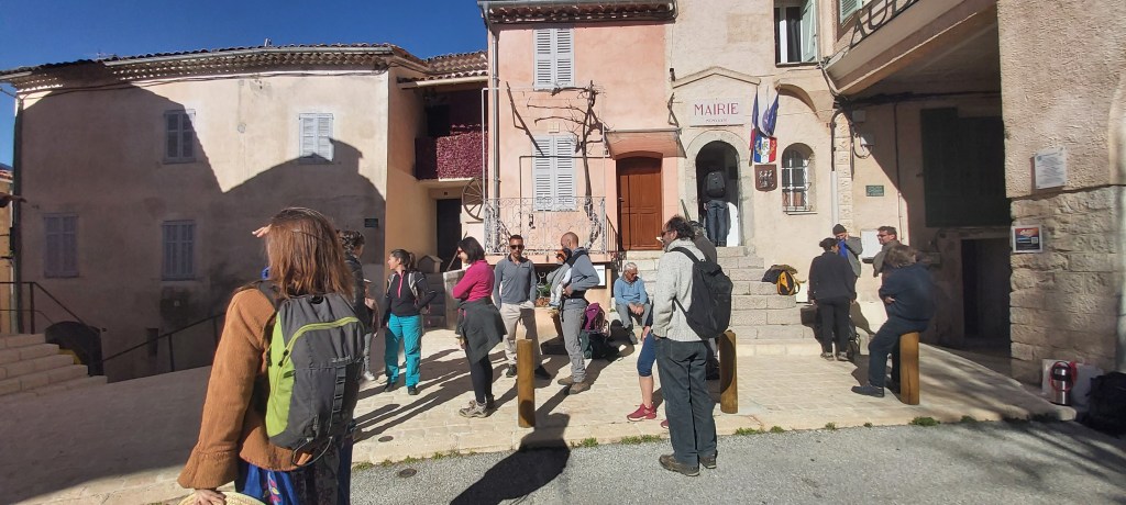 Aux alentours de neuf heures du matin, une joyeuse foule commence à se constituer devant la mairie d’Aiglun. Nous sommes ravis de voir que le public a répondu à l’appel de la poésie. Certaines personnes sont même venues de relativement loin. Et il y a aussi des gens du village, ce qui fait plaisir. Cela nous conforte dans notre désir de faire résonner les mots de poésie là où on n’a pas forcément l’habitude de les entendre : dans l’arrière-pays, et dans la nature, après les quartiers de Nice. Parmi les randonneurs, nous avons eu le plaisir de retrouver Gabriel Fabre, poète et habitant de la Petite Maison de Poésie, Pascal Giovannetti, poète et animateur de scène slam, Magali Revest, danseuse performeuse, intervenant à d’autres moments du festival.