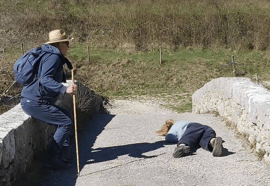 Nous descendons progressivement jusqu’au pont qui traverse la rivière. C’est là que nous attendent Dominique Massaut et Emmanuelle Pepin. Le poète entonne un poème très bien choisi, que l’on dirait écrit pour l’occasion, en ce qu’il évoque des choses qui se trouvent autour de nous : rivière, montagne, ciel, eau… En même temps, la danseuse Emmanuelle Pepin entreprend une performance corporelle silencieuse, avec des gestes très lents qui miment la marche, jusqu’à se rapprocher progressivement du sol. Ils traversent très lentement le pont, et nous leur emboitons le pas, poursuivant notre marche.