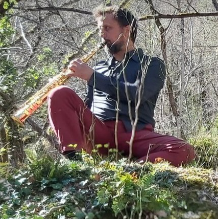 Bientôt, en effet, nous entendons des bruits. On dirait des cris de dinosaures. Nous découvrons le saxophoniste Lionel Garcin perché sur un rocher surplombant la rivière. Il tire de son instrument des sons inhabituels, moins des notes que des sons, qui nous transportent dans un univers insolite. J’ai vraiment l’impression qu’un dinosaure va surgir de cette nature luxuriante. En même temps, Emmanuelle Pépin est habitée par des gestes lents et insolites, par lesquels elle semble communiquer avec les cailloux, les troncs, les bouts de bois. Elle se roule par terre et ses cheveux longs se recouvrent de feuilles de chêne. C’est alors que s’élève la voix de Dominique Massaut pour un nouveau poème.