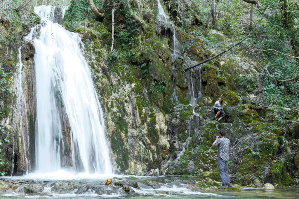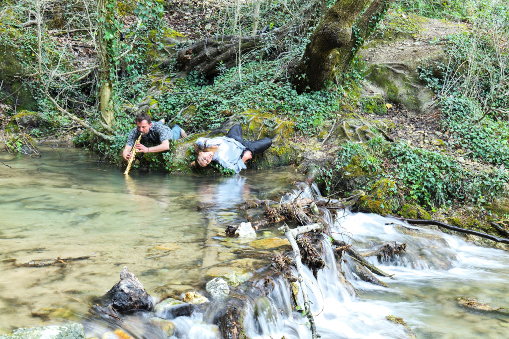 Nous reprenons ensuite notre marche, accompagnés par les artistes, jusqu’à arriver au pied de la cascade de Vegay. Après les pluies abondantes des semaines passées et la fonte des neiges, la cascade est particulièrement puissante et nous offre un beau spectacle. Nous prenons le temps de la contempler, jusqu’à nous rendre compte que la danseuse et le saxophoniste se trouvent sur l’autre rive. Ils nous proposent alors un spectacle incroyable. Progressivement, en contact avec les arbres et les parois rocheuses, ils se rapprochent de l’eau et entrent de plus en plus en contact avec l’élément liquide. Lionel Garcin joue du saxophone dans l’eau, immergeant l’embouchure de son instrument, pour en extraire des sonorités inattendues et insolites. Emmanuelle Pépin évolue d’abord sur les rives, puis grimpe sur les rochers, avant de finir dans le bassin lui-même, déployant ses gestes gracieux au pied de la cascade. La voix de Dominique Massaut résonne alors à nouveau et nous entraîne encore un peu plus dans la féerie de l’instant.