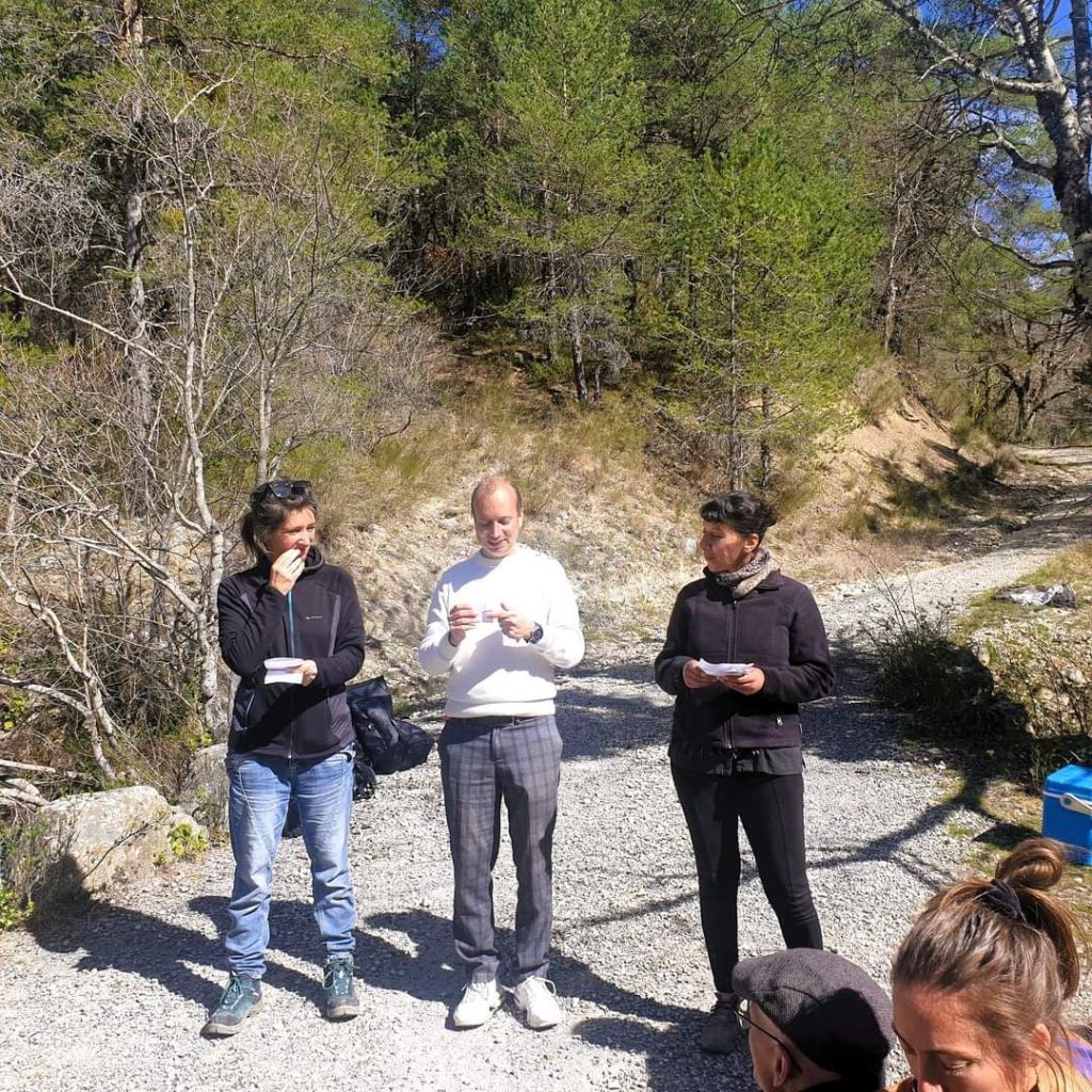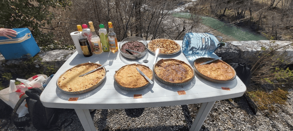 Alors que le festival touche à sa fin, nous entamons le retour, les yeux pleins d’étoiles, portant avec nous les souvenirs enchanteurs de cette journée à Aiglun. Nous contemplons sous un angle différent les paysages qui nous ont émerveillés, avec les roches ocres dominant la clue et le village perché qui se profile à droite. Arrivés au pont, une surprise nous attend : un pique-nique généreusement préparé par Sylvain, le compagnon de Sabine Venaruzzo. Ses quiches et ses gâteaux, confectionnés avec amour, régalent nos papilles. J’ai appris plus tard qu’il a veillé une grande partie de la nuit pour les préparer, et ma gratitude envers lui s’accroît encore davantage. Il aurait fallu l’aider davantage. Assis ensemble, artistes et public se mêlent dans une atmosphère de convivialité. Ce repas partagé, baptisé la « Popote des Poët Poët », clôture le festival dans une explosion de joie et de bonne humeur.