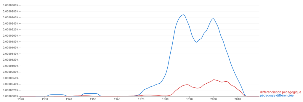 D’après ce graphique, il semblerait que ce soit à partir des années soixante-dix, mais surtout entre les années quatre-vingts et deux mille, que l’on parle de différenciation. On notera que l’expression de « pédagogie différenciée » est apparemment beaucoup plus populaire que celle de « différenciation pédagogique ».
