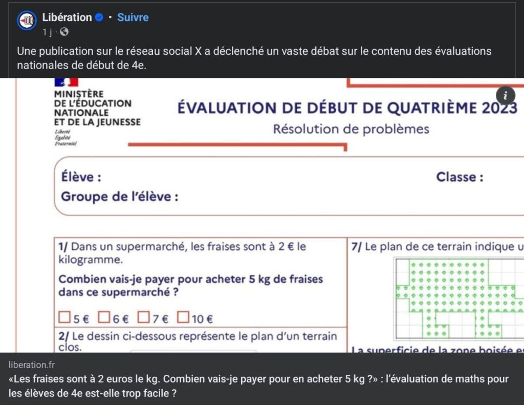 Les réseaux sociaux s’enflamment aujourd’hui à propos d’une question posée aux évaluations nationales de 4e en mathématiques, relayée par le journal Libération. Je voudrais ici donner un point de vue plus modéré sur la question, qui n’est que l’opinion d’un professeur des écoles.