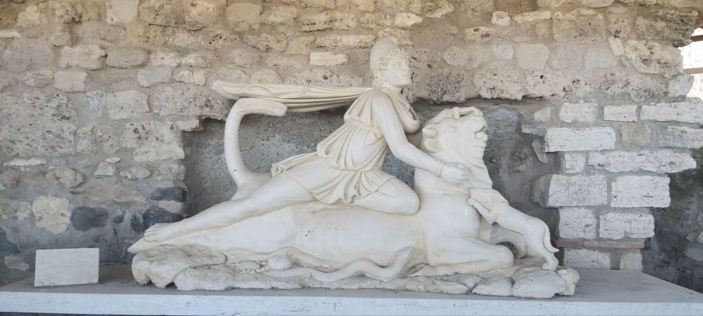 Nous avons vu aussi un temple dédié à Mithra, divinité d’origine perse dont le culte s’est diffusé jusque là. Il en reste une belle statue (elle présente sur le site est une copie) et les bases de la structure. Le Mithraïsme occidental était une religion initiatique et secrète, dont les sanctuaires étaient souterrains. Comme dans tous les cultes à mystères, il fallait être initié pour être admis, et jurer de ne rien révéler de ce qu’il s’y passait. L’entrée était réservée aux seuls hommes, et l’initié pouvait progressivement gravir sept échelons hiérarchiques, à travers des épreuves et des cérémonies dont nous savons peu de choses, étant donné leur caractère secret. L’apogée du mithraïsme eut lieu dans les deuxième et troisième siècles après Jesus-Christ, où il se répandit essentiellement dans les classes populaires (militaires, esclaves, ouvriers, artisans), même s’il conquit aussi parfois des membres des classes supérieures. Le mithraïsme ne fut jamais religion d’État, et fut un temps en compétition avec le christianisme, avant que cette dernière religion ne l’emporte définitivement.