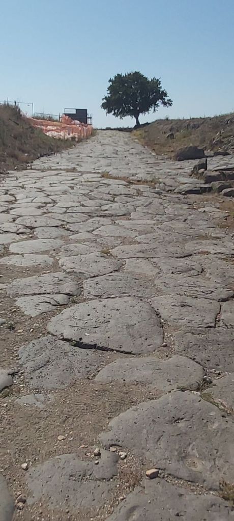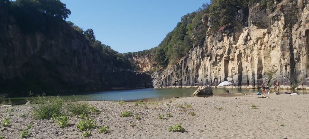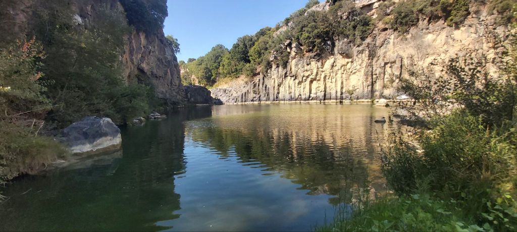 La promenade archéologique emprunte par moments des voies antiques, dallées de vieilles pierres. Après un passage dans les sous-bois, elle débouche sur un lac entouré de falaises, le lac Pellicone, qui fait partie intégrante du parc archéologique.