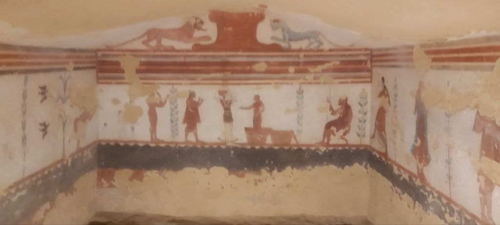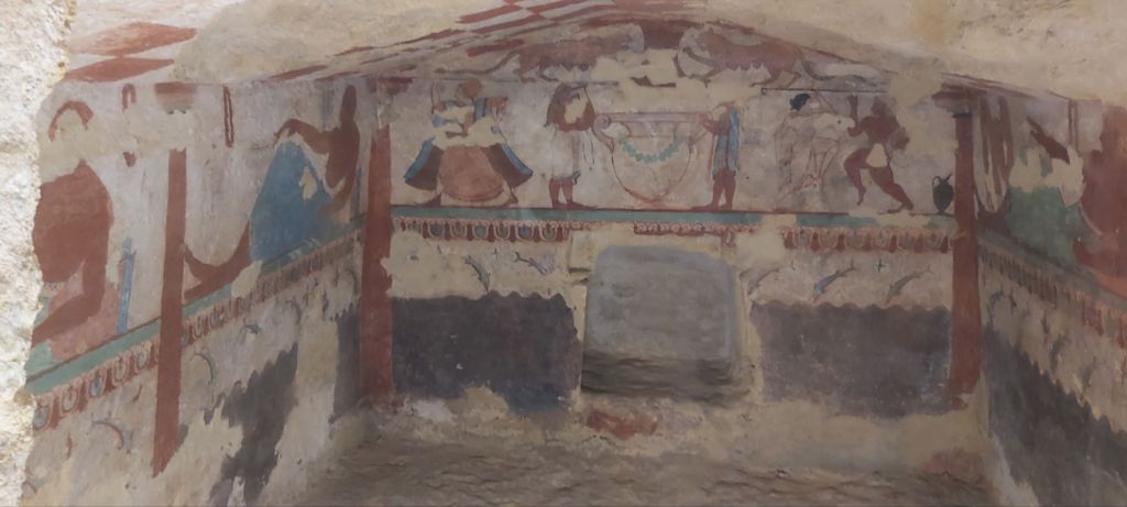 Ma troisième rencontre avec le monde étrusque, sans doute la plus impressionnante, a été la nécropole de Tarquinia, également appelée nécropole de Monterozzi. Imaginez un vaste champ vallonné, recouvert de petites collines qui sont en réalité des tombes antiques. Leur entrée est protégée par une construction moderne. Ce qu’il y a à voir se trouve donc sous terre, au pied d’une volée d’escaliers, ce qui n’est pas désagréable, car cela permet de s’extraire régulièrement de la chaleur de l’été. De la surface, on ne se douterait pas qu’un trésor inestimable se cache sous le sol. Les tombes sont en effet recouvertes de fresques toutes plus richement décorées les unes que les autres. Je ne vois, comme point de comparaison, que la Vallée des Rois en Égypte. C’est dire si j’ai été impressionné par la beauté, la finesse, la diversité, les couleurs de ces fresques qui représentent des scènes de la vie quotidienne, et permettent ainsi d’imaginer la vie des Étrusques. On voit des gens qui dansent, qui jouent de la musique, qui banquettent, qui pêchent… On voit aussi des animaux, des dauphins, des lions…