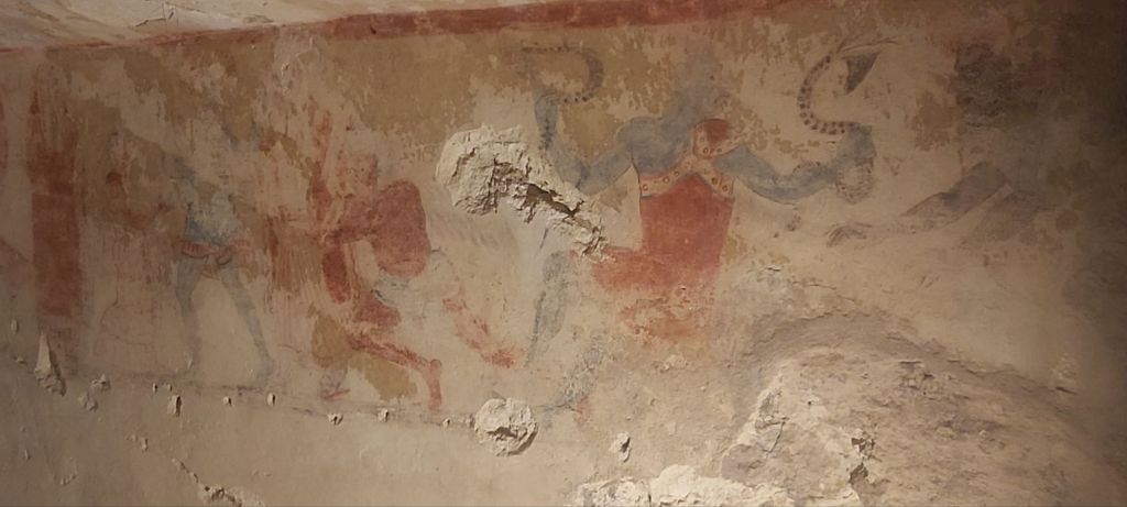 Lors de mes visites sur des sites étrusques, je n’ai vu qu’une seule fois de l’écriture, et je me suis demandé s’il s’agissait d’un nom ou d’un nombre. Voici la photo d’une fresque surmontée d’écriture :
