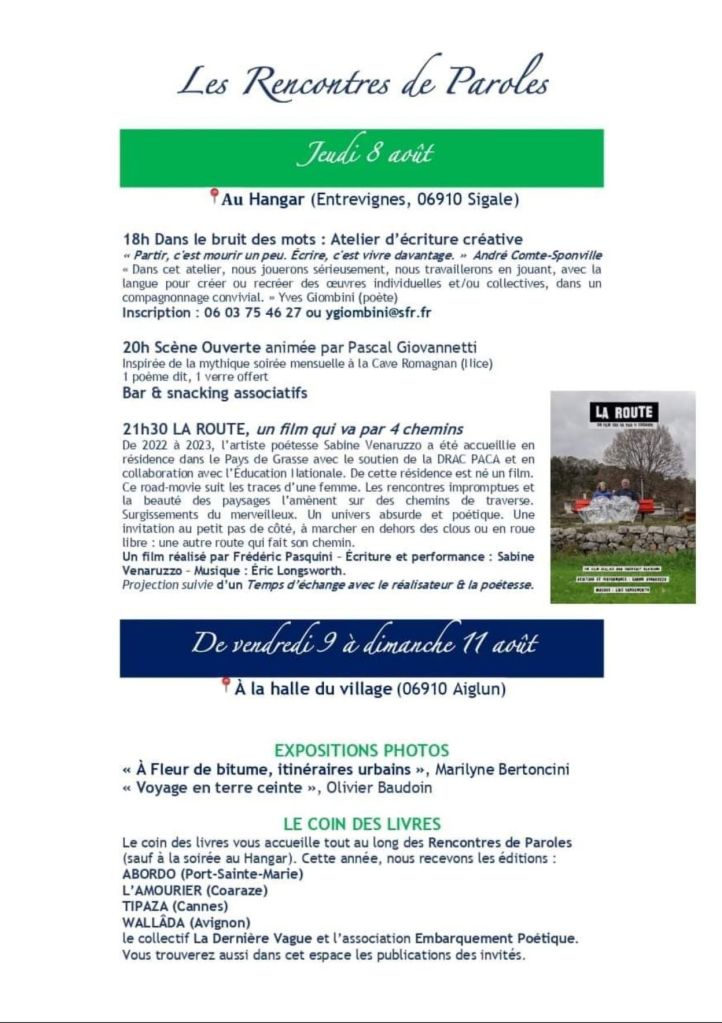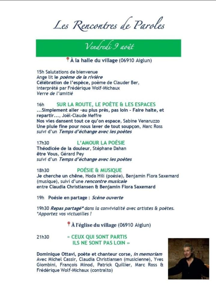 Depuis 2018, les Rencontres de Paroles d’ Aiglun ont pris une forme plus officielle, grâce à l’engagement de la mairie, de l’association culturelle « Le Hangar », et surtout de Hoda Hili, poète et philosophe. Née en 1983, elle a animé des débats philosophiques à la Bibliothèque Louis Nucéra de Nice, avant d’enseigner la philosophie à la Haute École du Travail Social de Nice. Elle est également, comme moi, une membre active du PoëtBuro, qui organise chaque année, au mois de mars, les Journées Poët Poët. Soucieuse d’un retour à la terre, et d’incarner les deux sens du mot « culture », Hoda Hili cultive également le safran et l’olive à Aiglun. Elle a publié récemment Nuits diphoniques aux éditions Maelström, dont j’ai rendu compte sur ce blog.