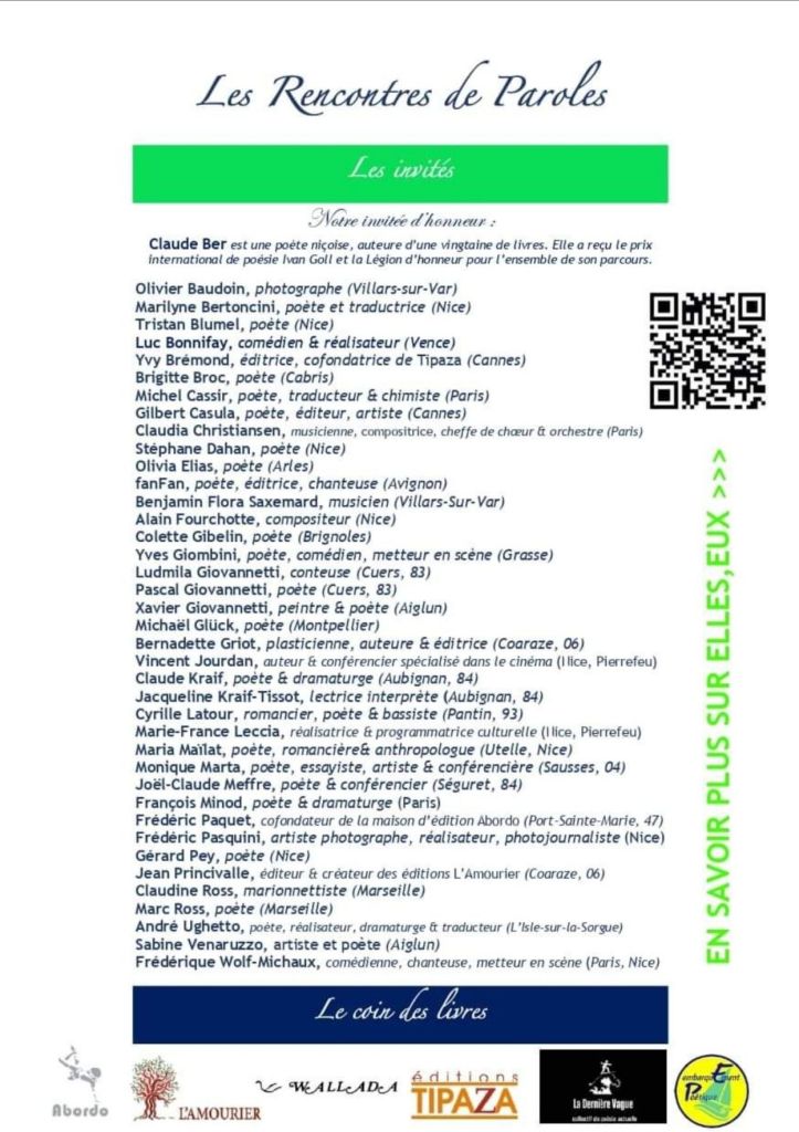 Elle se définit volontiers comme « Pariçoise », afin d’évoquer son double attachement à la capitale française et à notre belle cité azuréenne. Agrégée de lettres, elle a longtemps enseigné dans le Secondaire et le Supérieur, avant d’exercer des fonctions nationales au Ministère de l’Éducation. Parmi ses nombreux recueils, on peut citer Épître Langue Louve, Il y a des choses que non et La mort n’est jamais comme. Claude Ber rumine une poésie éminemment authentique, viscéralement humaniste, qui maintient face aux injustices contemporaines la résistance d’un « non » salvateur. Plusieurs de ses recueils figurent en bonne place dans ma bibliothèque, et vous en trouverez la recension dans les colonnes de ce blog. J’ai rencontré pour la première fois Claude Ber à Cerisy, à l’occasion du colloque consacré à Marie-Claire Bancquart qui était l’une de ses amies. J’ai eu le plaisir de la retrouver en de nombreuses circonstances, notamment lors de rencontres organisées par « Embarquement poétique », lors du Festival Poët Poët, ou encore d’événements organisés par l’Université de Nice.