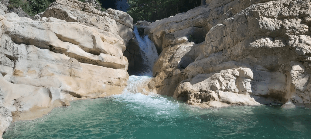 Je comptais profiter de la matinée libre pour me baigner dans la clue d’Aiglun, et je suis ravi de voir que Tristan et son père ont eu la même idée. Dès le petit-déjeuner terminé, nous suivons donc le petit sentier caillouteux qui part des halles du village, et qui serpente parfois au-dessus du vide. Le jeu en vaut pourtant la chandelle, puisque nous nous baignons dans de très belles vasques à l’eau cristalline. De retour au village, nous mangeons à l’auberge. Pour ma part, je me régale d’un délicieux magret de canard, servi avec un planteur.