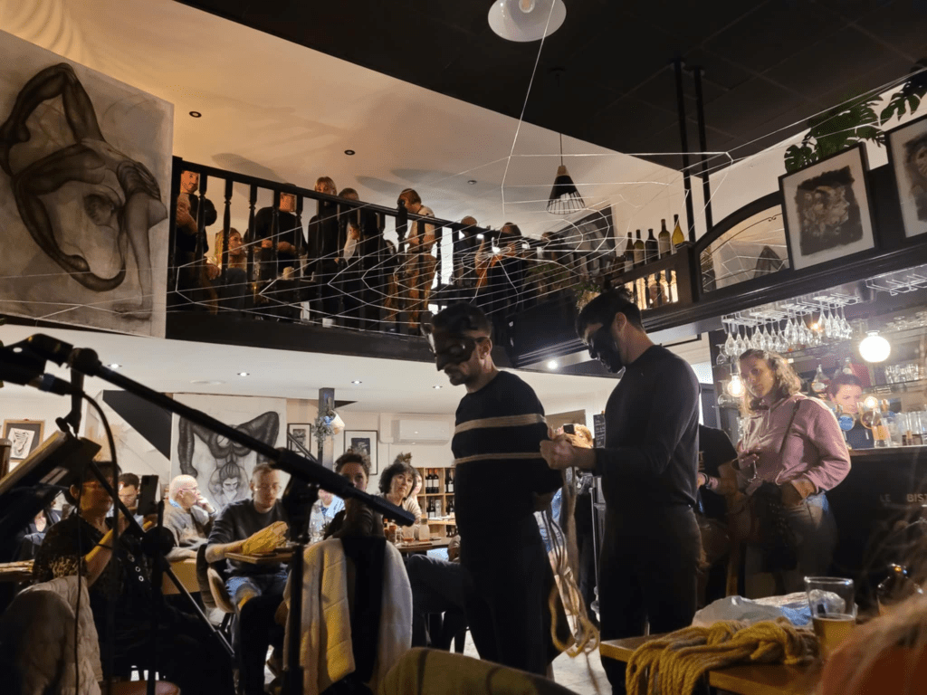 Le point culminant de cette immersion dans le noir a été la performance de shibari, un art japonais mêlant esthétique, émotion, technique et sensualité, présentée par Ariel Tonello, accompagné de Joan. Grâce à la musique envoûtante de Ryuichi Sakamoto, cette performance a captivé l’assemblée, créant un moment suspendu dans le temps.