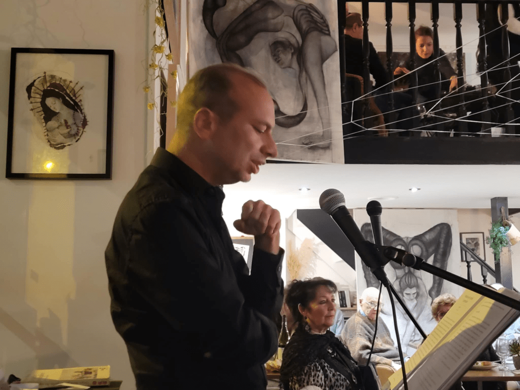 Dès l’arrivée, l’accueil chaleureux des propriétaires du bistrot, Aurore et Camille, a posé les bases d’une soirée conviviale. Avec une passion communicative, elles ont créé un espace où l’art et la poésie se rencontrent en toute simplicité. La présence d’œuvres d’art soigneusement choisies, dont une gigantesque toile d’araignée en film plastique, instaure un cadre chaleureux, où l’on se sent bien. Je suis toujours heureux de venir au Bistrot Poète, quel que soit le type de manifestation, car l’on s’y sent vraiment bien accueilli.