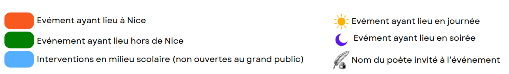 Comme chaque année, je diffuse une version allégée du programme qui permet d’avoir une vision sur l’ensemble des événements en un clin d’œil. J’ai représenté en orange les événements ayant lieu à Nice, en vert les événements ayant lieu dans d’autres communes, et en bleu les événements réservés aux scolaires. J’ai indiqué par un soleil les événements ayant lieu en journée, et par une lune les événements ayant lieu en soirée. J’ai mis un fond rosé aux événements où je serai personnellement présent. Cette version abrégée est disponible en téléchargement ci-dessous, au format PDF.