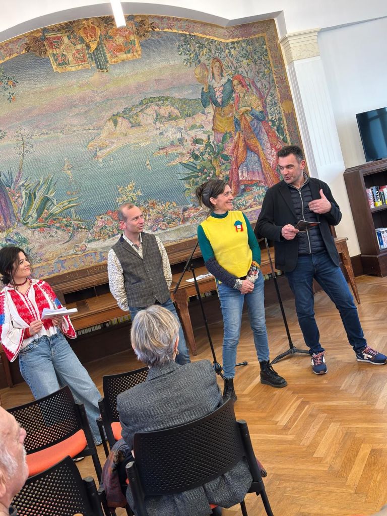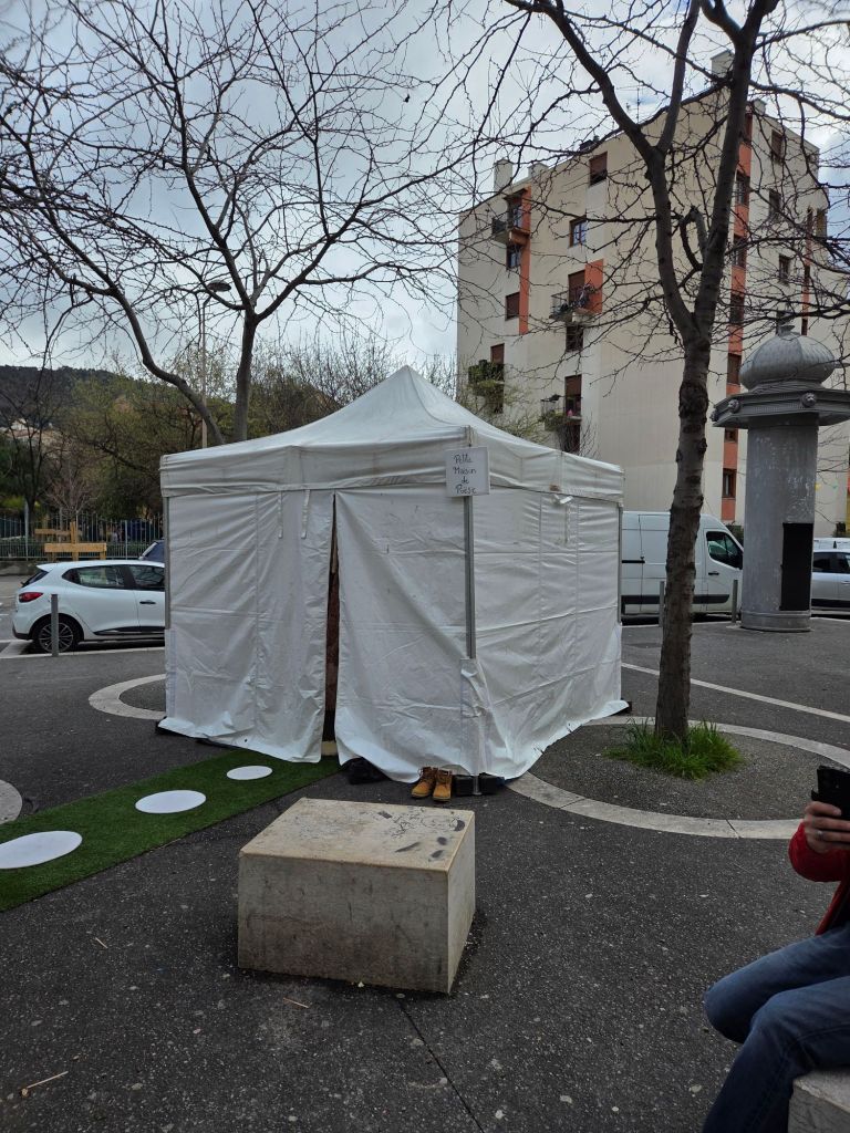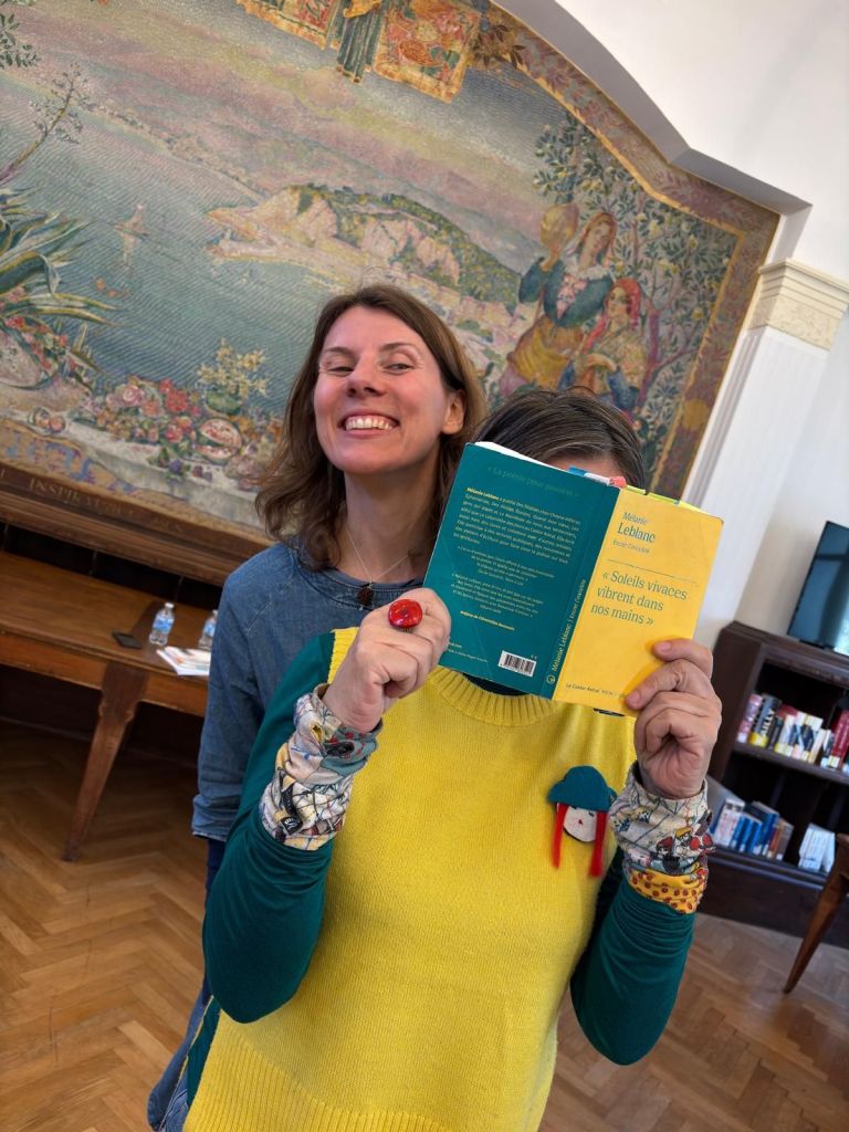 À l’extérieur de la Petite Maison de Poësie, poètes, artistes et bénévoles étaient présents pour accueillir le public, murmurer des poèmes à l’oreille des passants, les inviter à s’allonger sur un transat, ou leur proposer un instant de danse traditionnelle niçoise ! Malheureusement, à cause de la pluie, les rues étaient quasi désertes, mais cela n’a pas entamé notre bonne humeur…