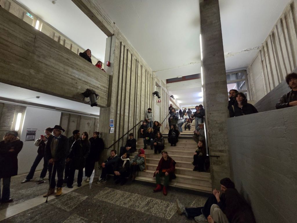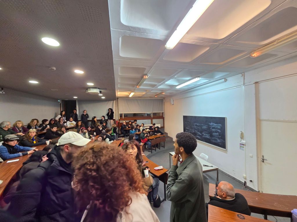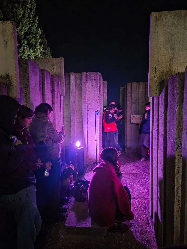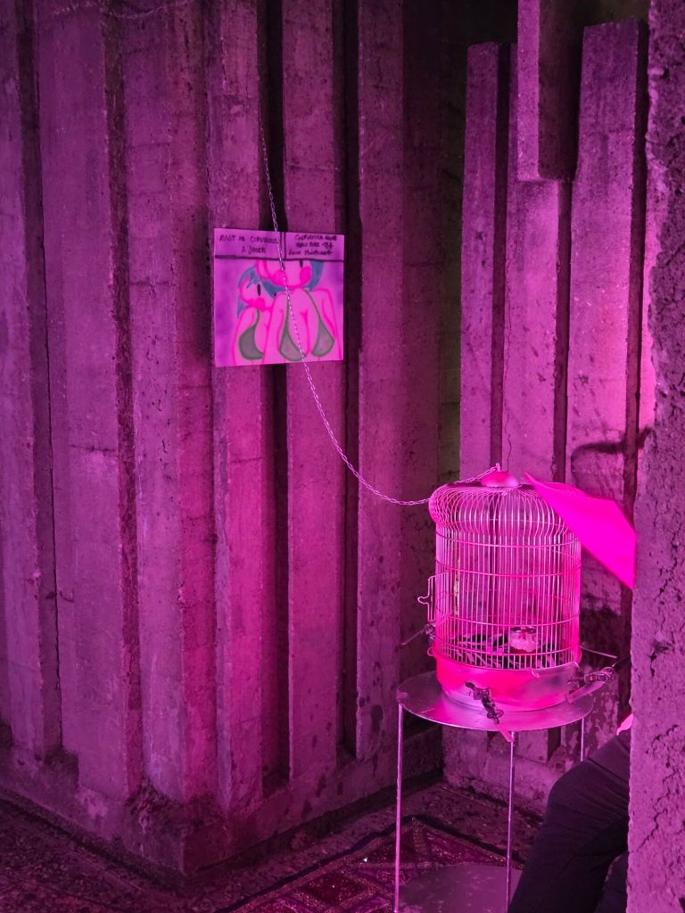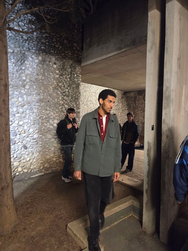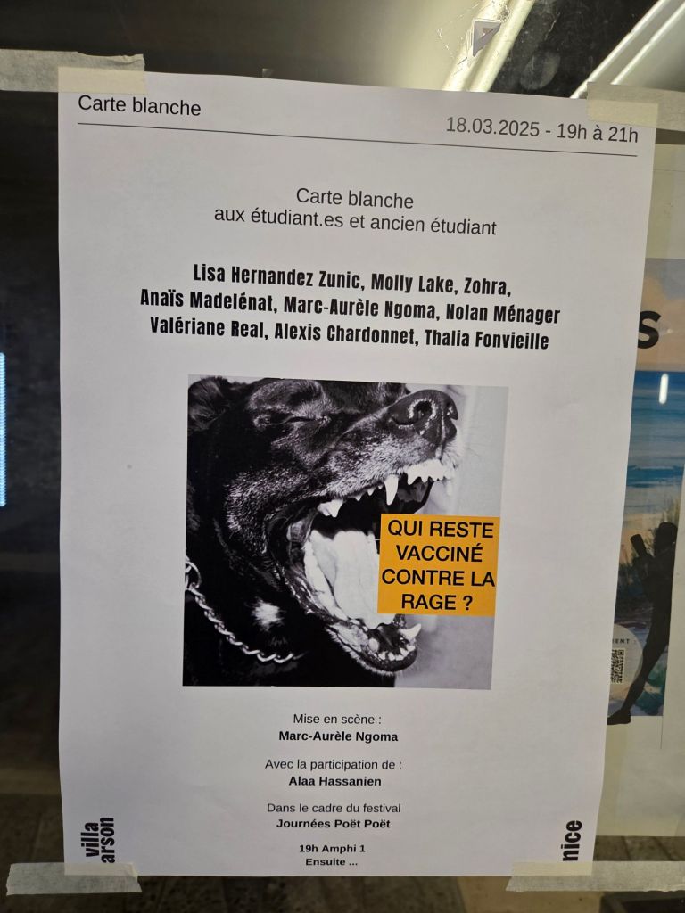 C’est une nouveauté de l’édition 2025 des Journées Poët Poët. Pour la première fois, le festival a investi la Villa Arson, célèbre école-musée d’art contemporain, située sur les hauteurs de Nice. Notre poétesse invitée a commencé par déclamer ses vers en arabe, avec une traduction française lue par Sabine Venaruzzo, dans le grand amphithéâtre de l’école, quasiment comble. Puis, menés par Marc-Aurèle, un ancien étudiant, les élèves de la villa Arson proposent des performances multi-sites simultanées dans différents espaces et jardins de la Villa. Les artistes se sont ensuite rejoints pour une performance finale dans le grand hall. C’est là que j’ai appris que leur collectif s’appelait : « Arson Réaction ».