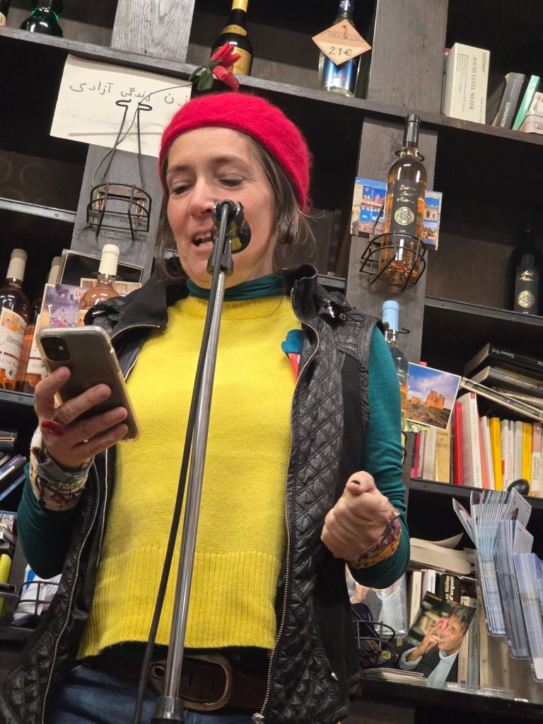 Ensuite, Jérémie Tholomé et David Giannoni prennent le relais, pour organiser une scène ouverte. De très nombreux poètes et artistes se succèdent au micro, mêlant sans hiérarchie aucune les générations, les genres et les styles. J’ai eu le plaisir d’entendre les performances de poètes que je connais bien, et d’en découvrir d’autres, notamment une performance d’une femme portant un intrigant chaperon rouge qui paraissait tout droit sortie d’un conte.
