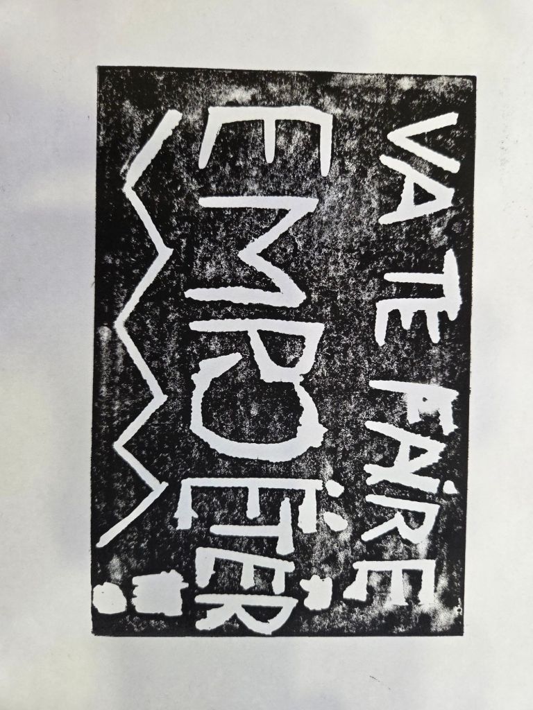 Après un tour de table où chacun était invité à donner sa définition de la poésie, les convives ont pratiqué des jeux poétiques comme celui du cadavre exquis. Place ensuite à la gravure sur linoléum, permettant une impression sur papier, avec un rendu très satisfaisant. Cela m’a donné envie d’en refaire, et pourquoi pas de tester avec mes élèves, car le procédé est assez simple, pour un résultat assez sympa.
