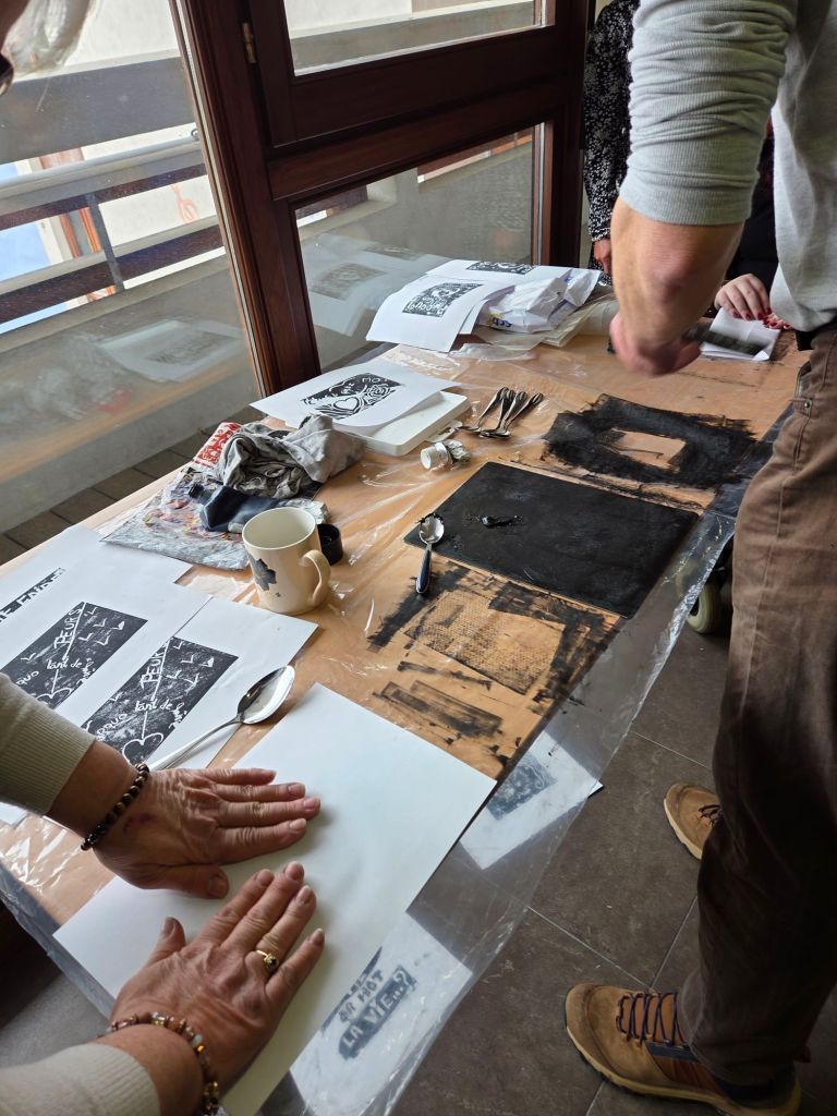 J’ai beaucoup aimé ce temps de création collective, ces jeux d’écriture où il n’y a pas d’auteur unique, puis le temps de linogravure qui changeait vraiment des ateliers d’écriture habituels.