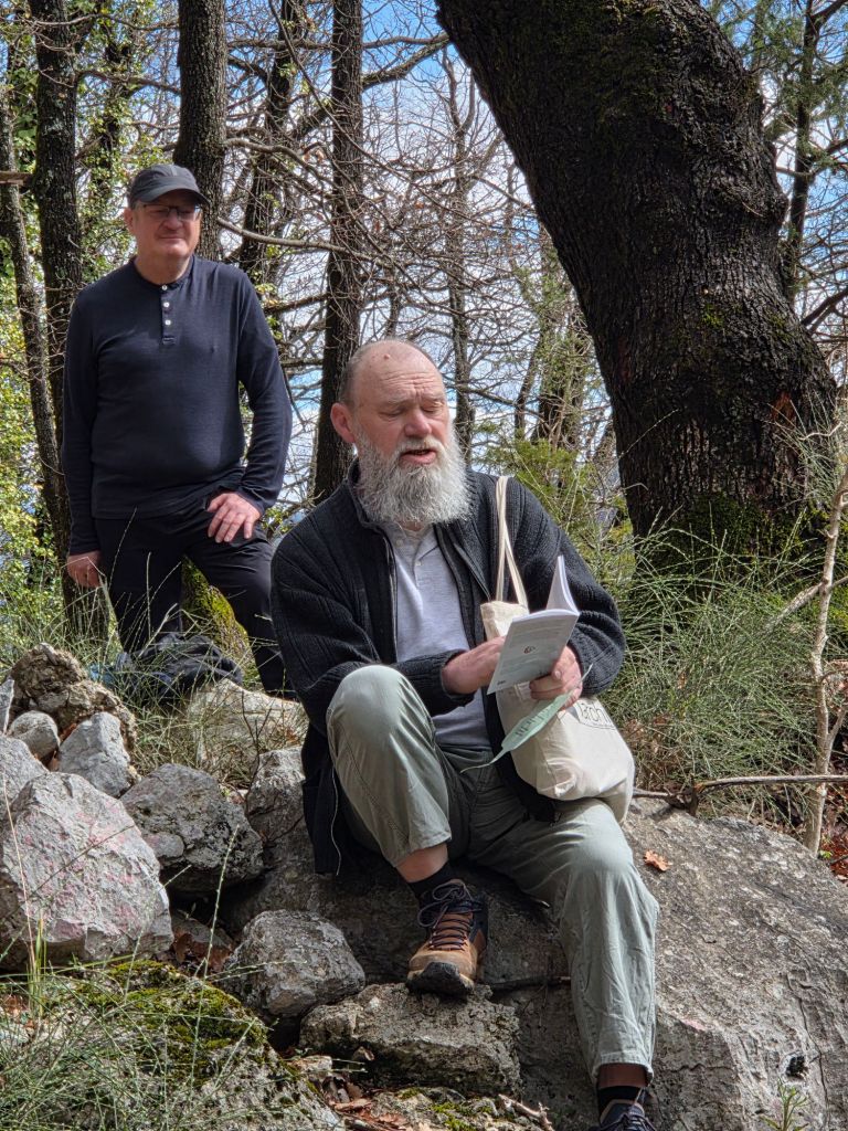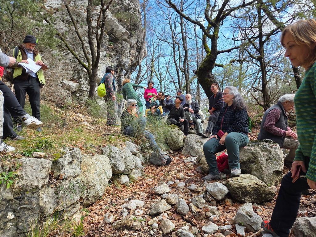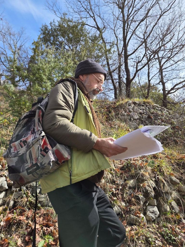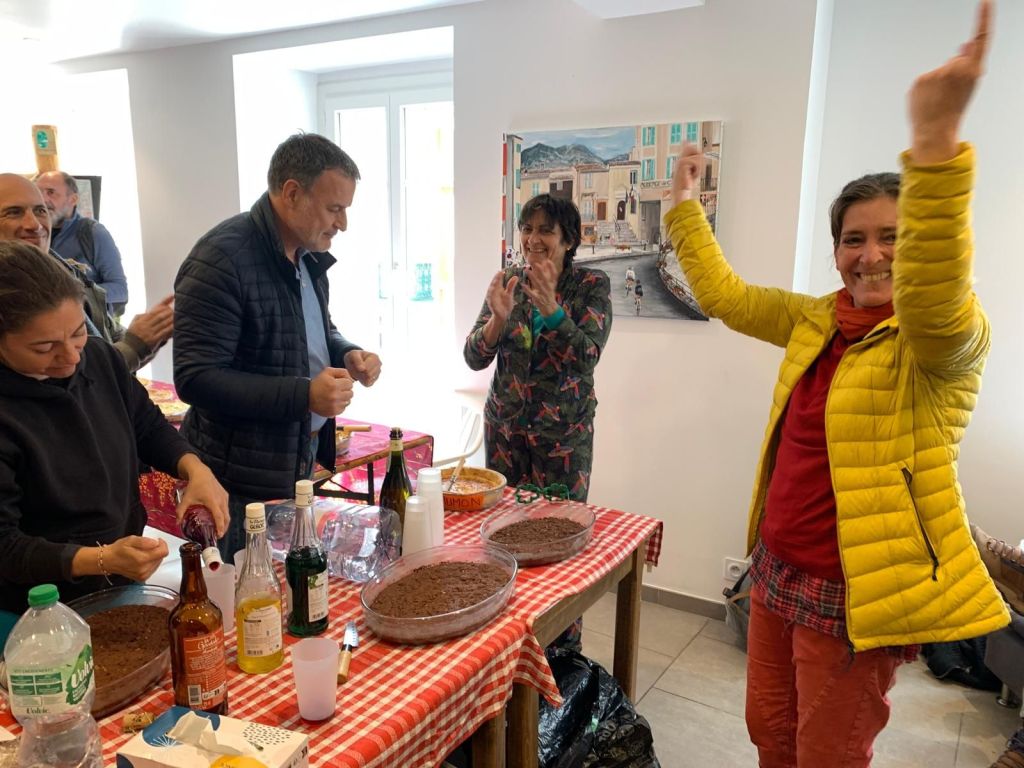 Nous sommes accueillis par le maire, Anthony Salomone, dans la salle du conseil municipal où nous partageons un café et des biscuits secs. C’est ensuite Timoteo Sergoï qui, par une performance mémorable, donne le départ de la randocriture, qui nous entraîne au-dessus du village, sur un sentier forestier depuis lequel on peut admirer un paysage magnifique.
