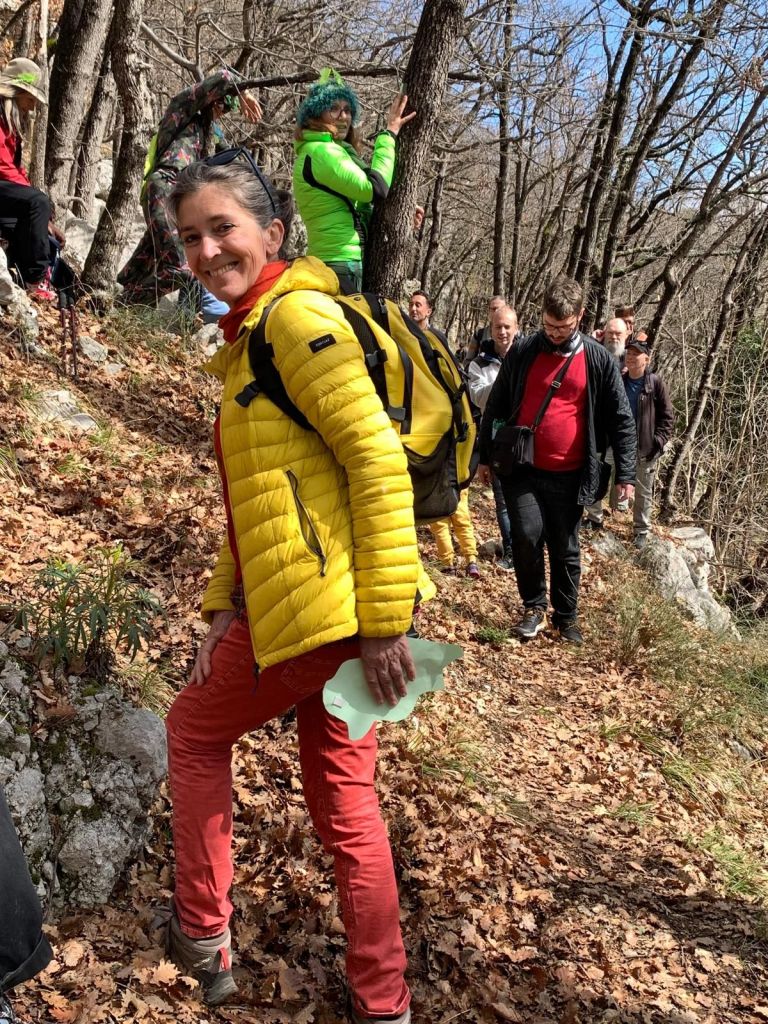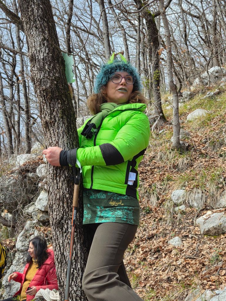 La randonnée est ponctuée par les interventions du Collectif du Tröm, une troupe de théâtre niçoise habillée pour l’occasion de plumes vertes. Les comédiens et les membres du PoëtBuro volontaires (dont bibi, bien sûr !) ont ainsi agrémenté la promenade par des lectures de poèmes d’Hélène Dorion. Nos pas nous ont conduits jusqu’à une source, avant de revenir par le même chemin.