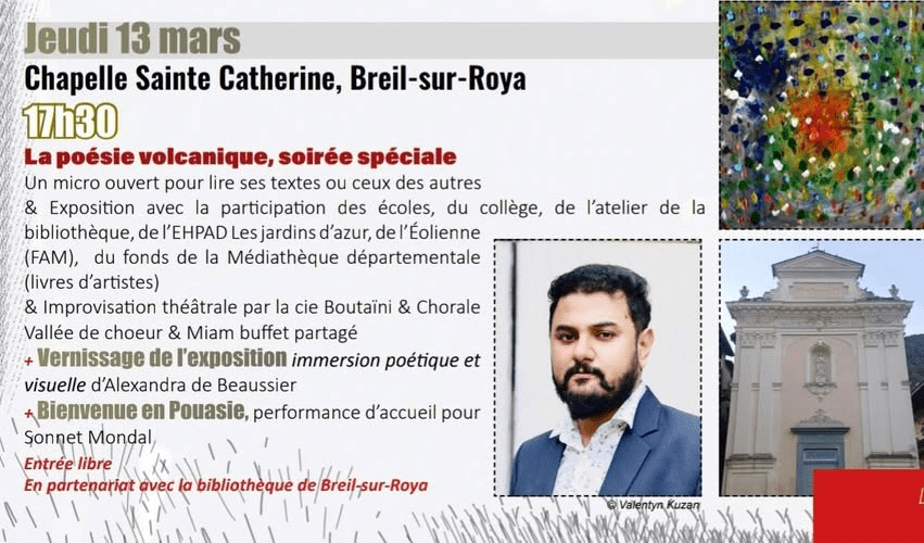 - Le mardi 25 mars, j’étais invité à l’université de Nice pour célébrer la « poésie volcanique », en présentant mon propre poème mais aussi le « volcan qui parle » de mes élèves.