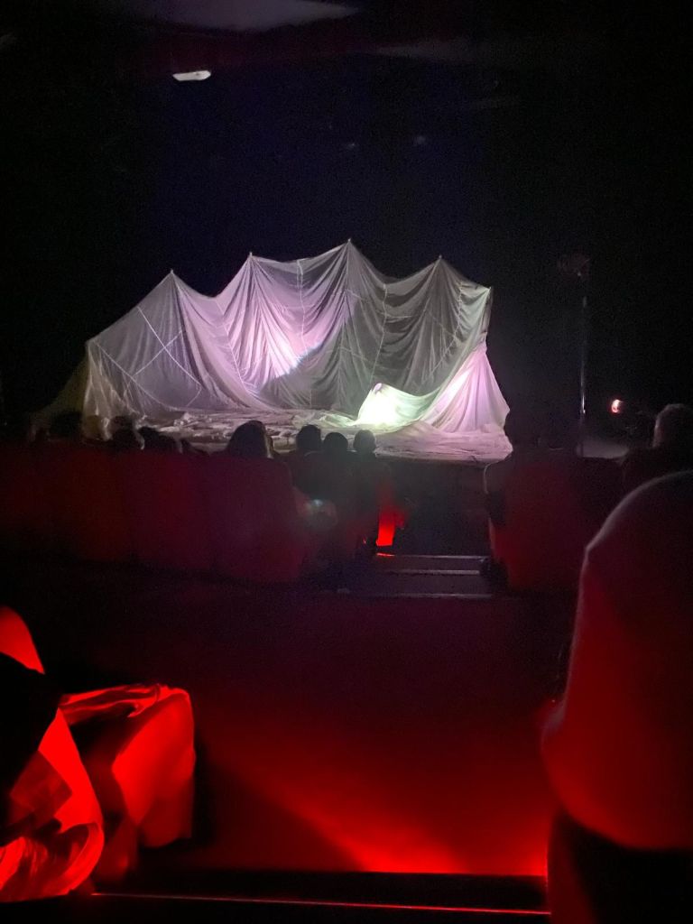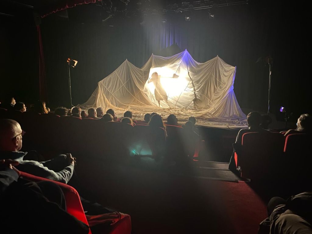 Le centre de la scène s’est ensuite éclairé, laissant voir une immense toile de parachute, animée par de puissantes souffleries, au sein de laquelle une poétesse-comédienne a émergé. Un moment de poésie absolument sublime, servi par des jeux d’éclairage très subtils et une évolution corporelle de la comédienne qui donne à voir comme une naissance, une libération, une sortie de chrysalide.