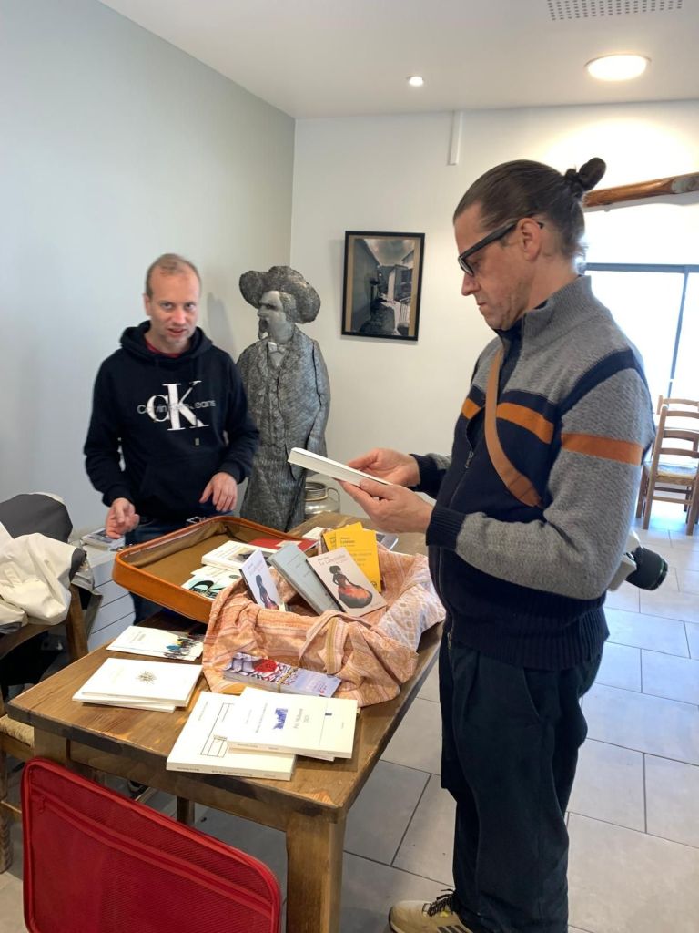 Pendant que les Journées Poët Poët débutent officiellement à Breil-sur-Roya, je suis chargé de récupérer à l’aéroport les poètes belges David Giannoni et Jérémie Tholomé. Bonheur de retrouver le premier, déjà invité l’an dernier et qui revient cette année moins en tant que poète que comme organisateur du Fiestival de Bruxelles. Et joie de rencontrer Jérémie, dont j’ai hâte de découvrir plus amplement l’univers.
