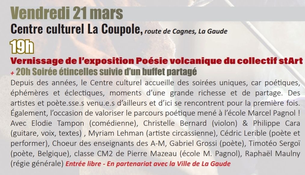 Malgré le mauvais temps qui nous a contraints de n’utiliser que les espaces intérieurs du Centre Culturel de la Coupole, la soirée « Étincelles » de La Gaude a tenu ses promesses. Chaque année, les Journées Poët Poët proposent un parcours atypique au sein des différents espaces de ce lieu magnifique dirigé par Gilles Faraut.
