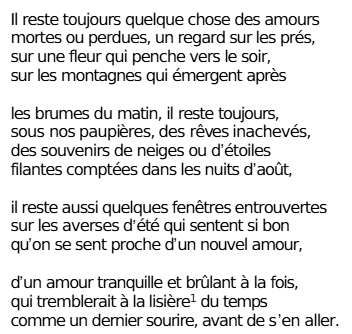 La reprise de la même structure (« il reste aussi… ») dans les tercets donne, de fait, une impression de continuité, estompant la rupture avec le passé et l’engagement vers « un nouvel amour ». On a l’impression que le poète se trouve dans un entre-deux, dans un temps de transition entre un amour qui n’est plus et un nouvel amour qui s’annonce. Le rapprochement presque oxymorique « tranquille et brûlant » confère à ce nouvel amour une profondeur singulière, où passion et sérénité se confondent.