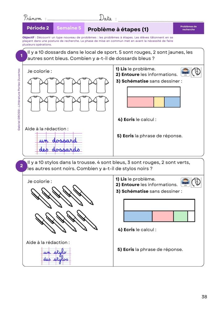 Mais aujourd’hui, c’est du rituel dont je veux parler. Celui-ci me sert avant tout à créer des automatismes méthodologiques. Lire attentivement l’énoncé, entourer les données, schématiser, écrire le calcul et rédiger la phrase-réponse… Ces problèmes sont plus faciles que ce que je demande en atelier.
