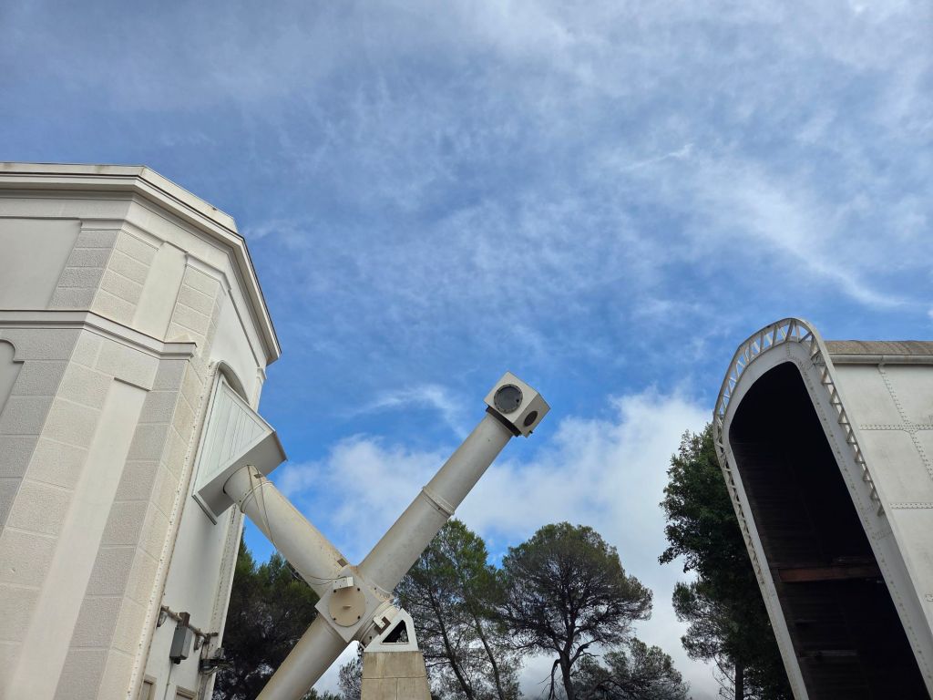 À partir du portail, il faut poursuivre en voiture pendant quelques minutes sur un chemin qui monte dans la colline au milieu des arbres. C’est dire l’immensité du domaine de l’observatoire, permettant ainsi le maintien d’une forêt sur le territoire de Nice, préservée de l’appétit des promoteurs. On nous fait garer à proximité d’une installation déjà assez imposante, la lunette coudée. L’avantage de ce coude, c’est qu’il permet de faire pivoter la lunette sans déplacer le socle sur lequel elle repose, la rendant ainsi plus maniable. De part et d’autre de la lunette, deux rails permettent de déplacer le couvercle qui protège la lunette lorsqu’elle n’est pas utilisée.