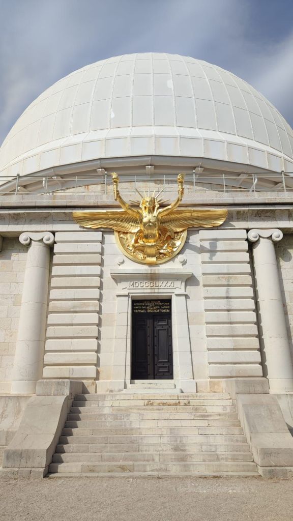 À notre arrivée à l’entrée, nous sommes accueillis par un vigile qui vérifie notre identité. Nous sommes autorisés à nous garer derrière l’imposant portail orné d’une statue. La villa du gardien, blanche et rouge, trahit déjà le caractère historique du lieu. Si l’Observatoire de Nice est toujours en activité, aujourd’hui partie intégrante de l’Université Côte d’Azur, son histoire remonte en effet au dix-neuvième siècle. À une époque marquée par le progrès scientifique et le positivisme, il fallait à la France un observatoire astronomique digne de ce nom. Aussi, quand le richissime mécène Bischoffscheim, à la tête d’une banque qui deviendrait plus tard la BNP, a proposé de financer la construction d’un observatoire à Nice, les autorités ont tout de suite accepté.