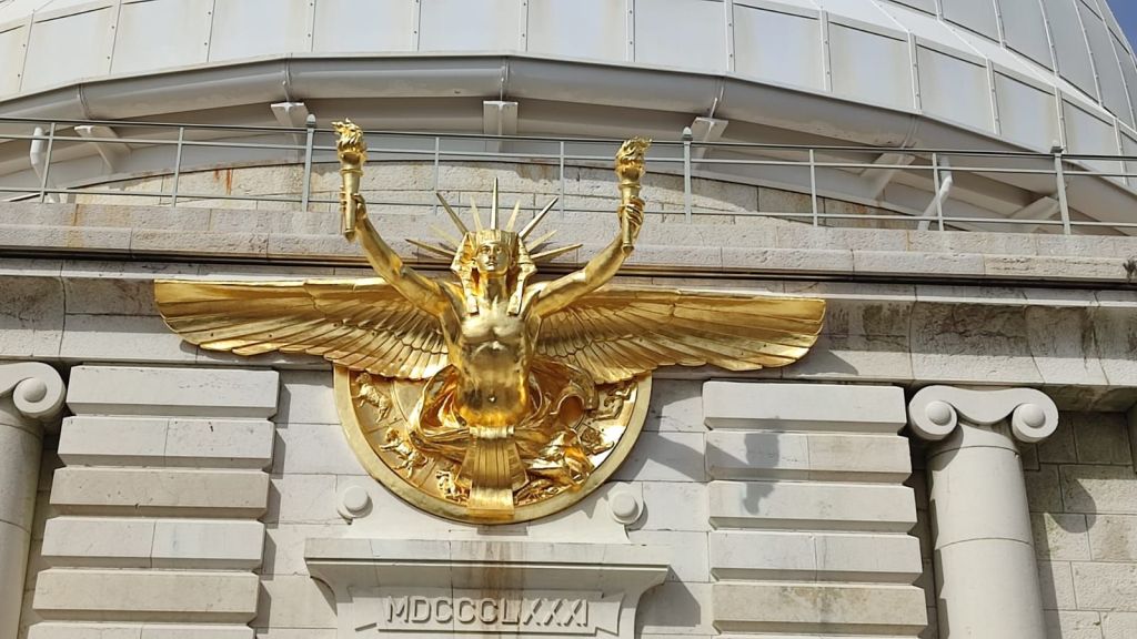 Le clou du spectacle est, bien évidemment, le grand observatoire, avec ses façades construites par Garnier (oui, celui de l’opéra), son immense coupole mobile de 24 mètres de diamètre construite par Eiffel (oui, celui de la tour), et sa grande lunette astronomique. Aujourd’hui, l’on utilise plutôt des télescopes que des lunettes, si bien que celle de Nice reste l’une des plus grandes au monde jamais construite (il en existe seulement quatre semblables au monde). La coupole est elle-même une prouesse technique, puisqu’elle est mobile et qu’elle reposait initialement sur de l’eau pour la rendre plus maniable (aujourd’hui, elle est actionnée par des moteurs électriques). Elle reste l’une des plus grandes coupoles mobiles du monde. Quant à la façade, avec son immense statue dorée d’apparence grecque, avec ses allures de pyramide et sa porte romaine, elle puise dans plusieurs civilisations antiques. Les deux flambeaux symbolisent la connaissance et la sagesse. C’est un monument qui impose le respect, par sa grandeur et sa beauté.