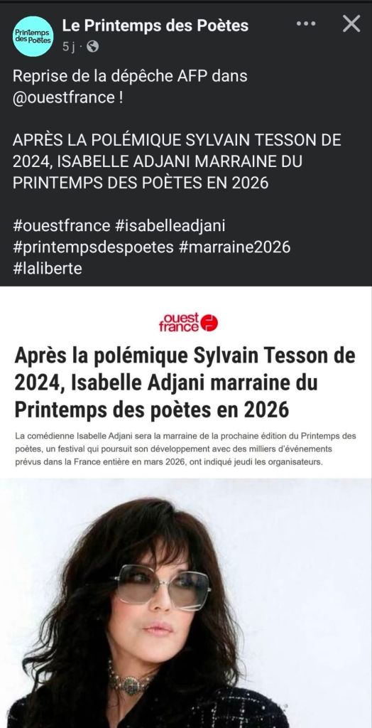 Je viens de voir cette information. Isabelle Adjani sera la marraine du Printemps des Poètes 2026. Un choix que l’on peut discuter.