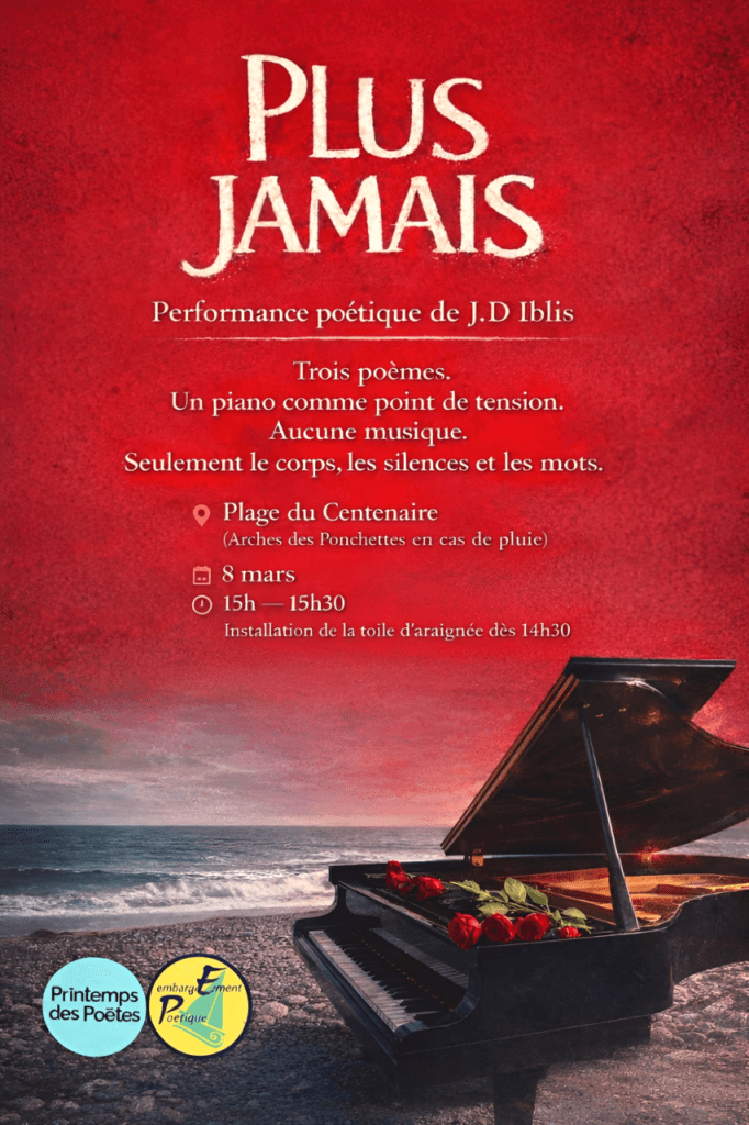 J’ai le plaisir de vous annoncer la performance poétique de mon ami J.D. Iblis, samedi 8 mars, sur la plage du Centenaire, à Nice. Un piano sans musique, le soleil, la Méditerranée, et la poésie… Le poète a généreusement accepté de répondre à mes questions. Entretien.