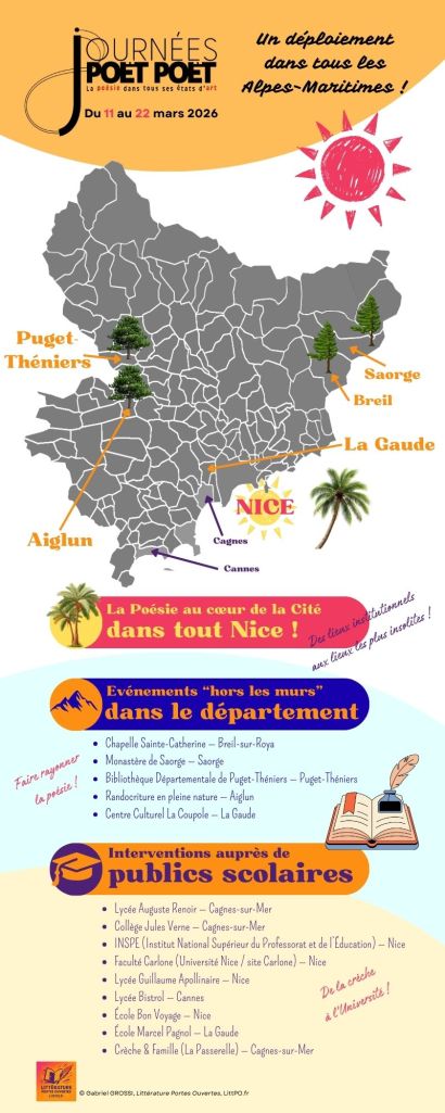 Du 11 au 22 mars 2026, les Journées Poët Poët déploient leur énergie poétique dans tout le département des Alpes-Maritimes. Lectures, performances, ateliers, randonnées, rencontres professionnelles et interventions scolaires composent une cartographie vivante : la poésie circule, relie, irrigue. Voici le panorama des lieux et des dates.