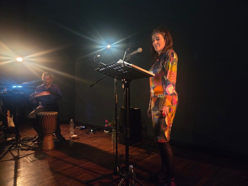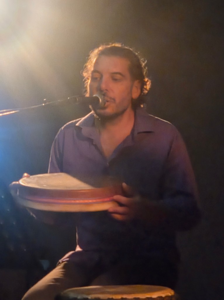 À ses côtés, dans l’auditorium, Bruno Desbiolles a manié djembé, tambourin, guitare électrique, guimbarde, voix… Grâce à sa pédale loop, il crée des mélodies envoûtantes, un peu planantes, suffisamment simples pour ne pas prendre le dessus sur le poème, mais en harmonie avec le ton et l’énergie de Sabine Venaruzzo.