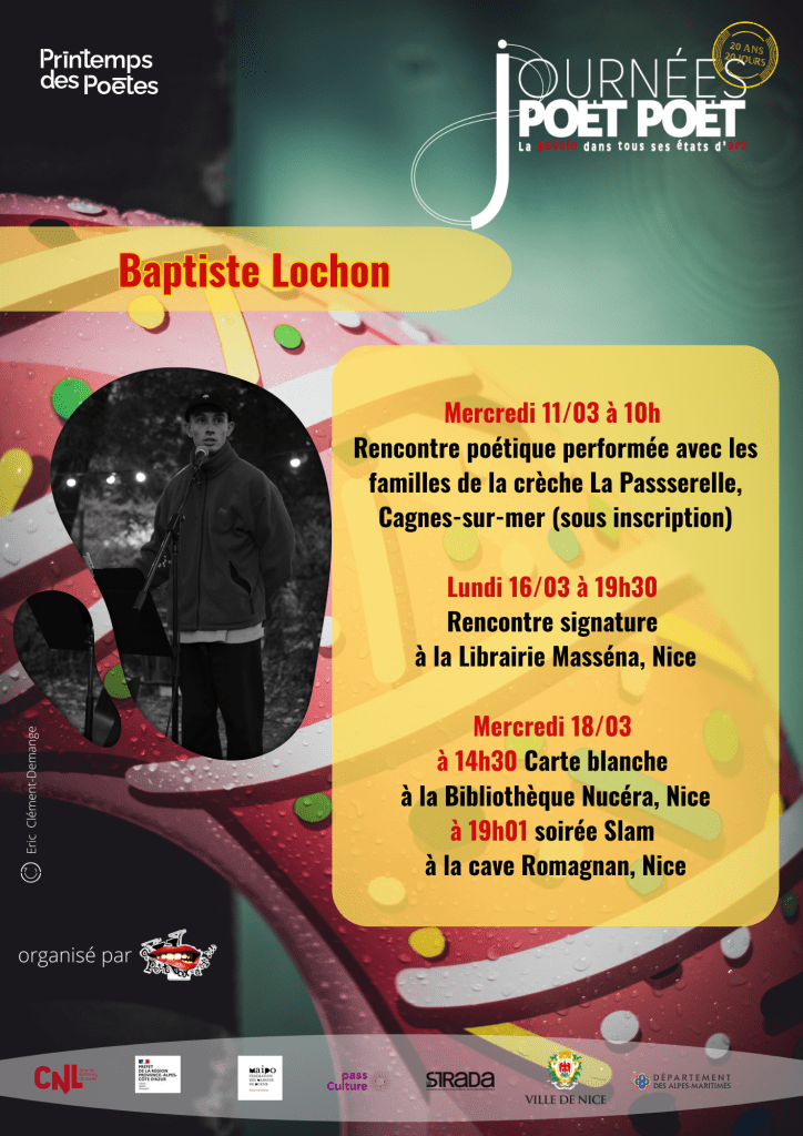 Depuis plusieurs années, le site LittPO.fr est partenaire des Journées Poët Poët, dont l’édition 2026 va avoir lieu du 11 au 22 mars. Pendant cette période, je vous permettrai de mieux connaître les poètes invités, avec des entretiens, des comptes-rendus des événements du festival, des citations, des analyses. Pensez à vous abonner pour ne rien rater !