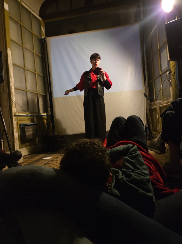 Puis Iris Colomb intervient en chair et en os devant l’écran. Pantalon noir, chemisier rouge. Elle déclame tout en faisant un numéro d’équilibriste, et passe fréquemment du français à l’anglais et de l’anglais au français. Cette performance était ma première rencontre avec l’univers poétique d’Iris Colomb, poétesse d’origine parisienne installée à Londres, et invitée des Journées Poët Poët. J’ai hâte de pouvoir découvrir plus profondément son univers.